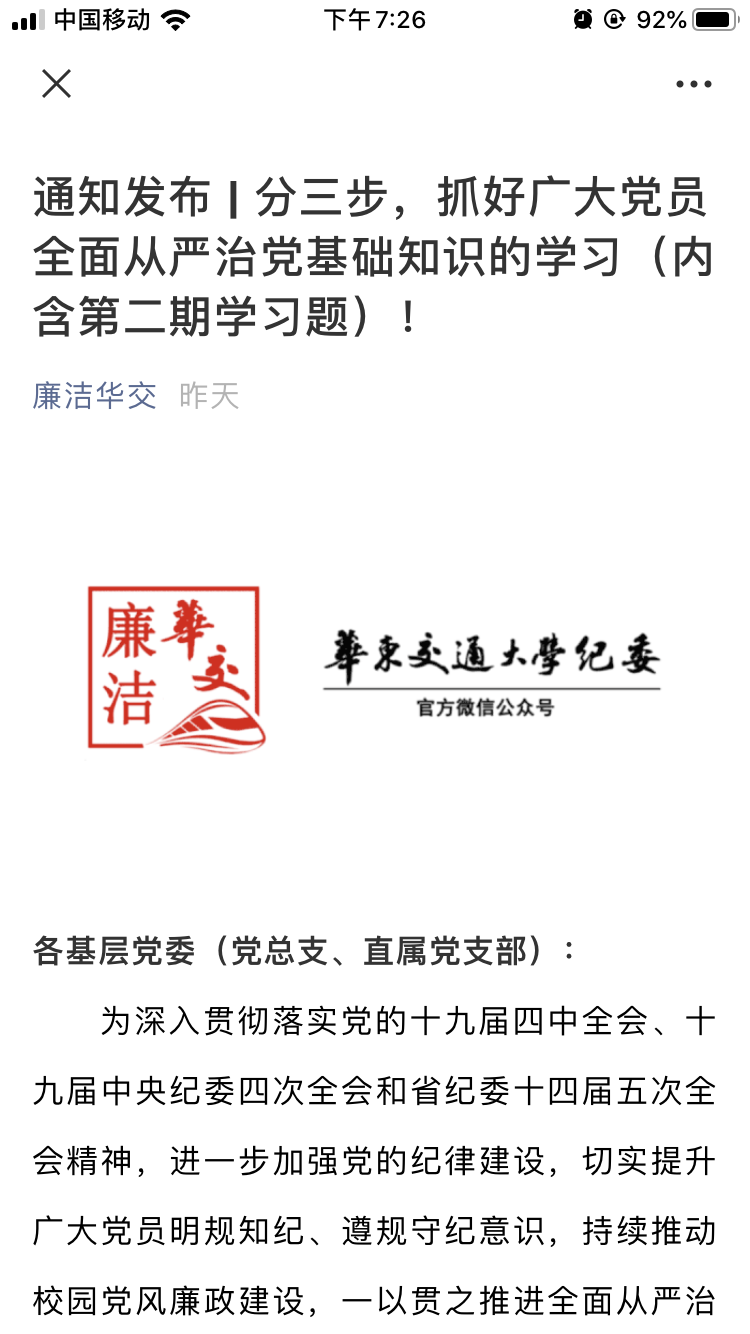 为切实提升广大党员明规知纪、遵规守纪意识,3月26日下午腾杰党支部举行了以“全面从严治党”为主题的线上党员活动日。腾杰党支部全体党员参加本次活动。